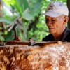Pamujo sedang memperbaiki beduk di rumahnya yang berada di Kelurahan Kertosari, Kecamatan Badadan, Kabupaten Ponorogo. Foto: Satria