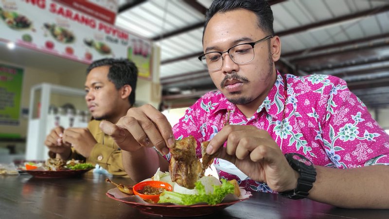 SANTAP MALON. Penikmat kuliner, Pradana, mengincipi olahan burung malon di Warung Sarang Puyuh "Mbak Nur", Kota Mojokerto. Foto: Karina Norhadini