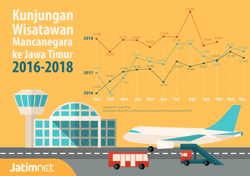 Secara umum pola kedatangna kunjungan wisman ke Jatim dalam dua tahun terakhir ini selalu naik. Tetapi sepanjang tahun 2018 ini sedikit mengalami perbedaan karena terjadi penurunan pada bulan September.