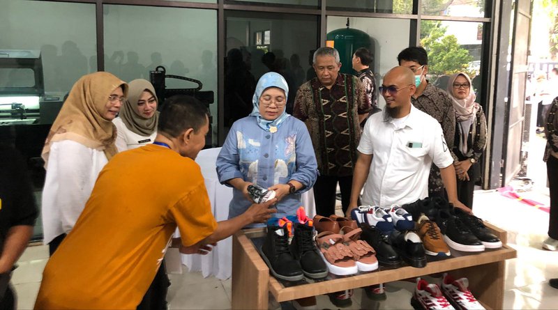 Dirjen IKMA Kementerian Perindustrian Reni Yanita (baju biru) melihat produk sepatu di gedung revitalisasi Diskopukmperindag Kota Mojokerto, Kamis, 9 Januari 2025. Foto: Hasan