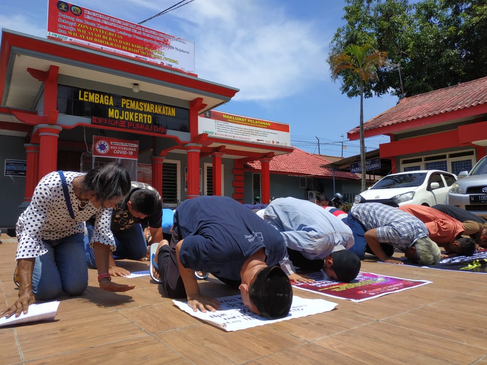 BEBAS. Napi Lapas Kelas IIB Mojokerto sujud syukur setelah dinyatakan bebas, Kamis, 2 April 2020. Pembebasan napi ini untuk mengurangi risiko penyebaran Covid-19 di penjara. Foto: Karina Norhadini