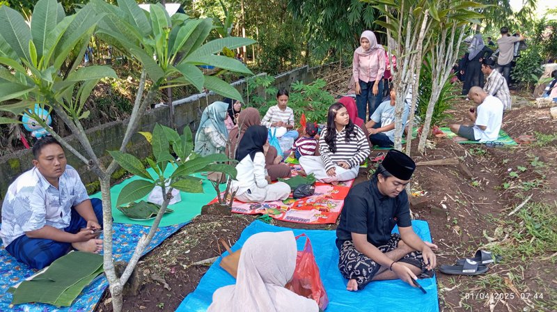 Ratusan warga Desa Bunder, Kec. Kabat, Kab. Banyuwangi, menggelat tradisi Lebaran Kuburan di pemakaman desa setempat pada 2 Syawal 1446 Hijriah atau Selasa 1 April 2025. Foto: Hermawan