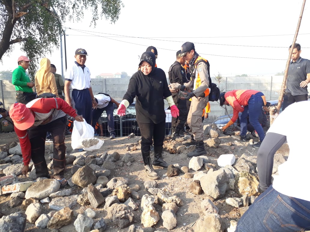RISMA. Wali Kota Surabaya Tri Rismaharini melakukan kerjabakti bersama ASN, TNI, Polri, BUMN, BUMD, siswa SD SMP se Surabaya di kawasan pesisir Kenjeran