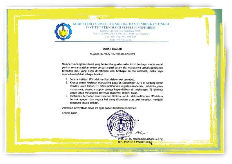 JATIMNET.COM, Surabaya - Aksi demonstrasi mahasiswa yang berlangsung sejak 23 September 2019 juga melibatkan institusi kampus, baik yang disampaikan melalui rektor atau pun dosen. Tidak terbatas dalam bentuk kehadiran mereka di lapangan, namun berupa tindakan atau pun pernyataan tertulis yang berdampak pada aksi.