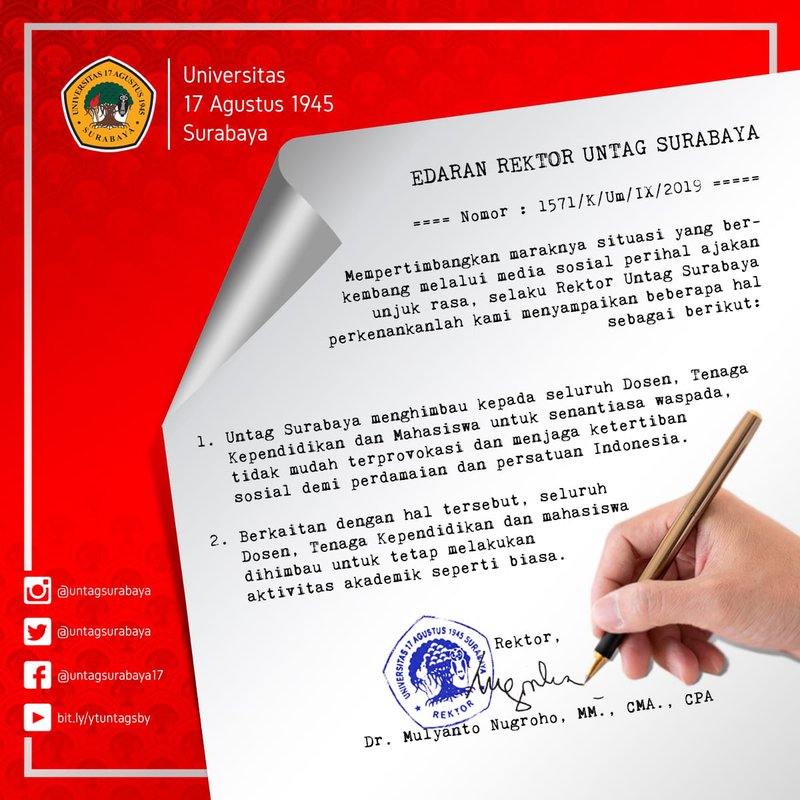 3. Universitas 17 Agustus 1945 Surabaya (Untag) menyerukan untuk berkegiatan seperti biasa
