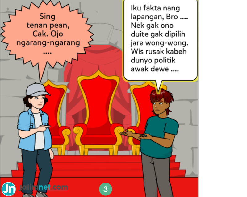 Cak Gondrong: Iku fakta nang lapangan, Bro …. Nek gak ono duite gak dipilih jare wong-wong. Wis rusak kabeh dunyo politik awak dewe ….)