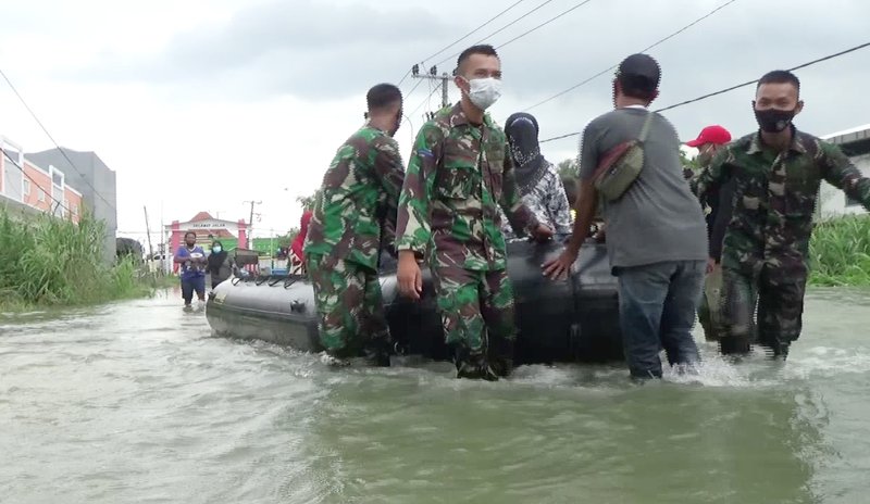EVAKUASI. Prajurit Resimen Artileri 2/Marinir membantu evakuasi warga Desa Iker-Iker Geger, Kecamatan Cerme, Gresik, terdampak banjir Kali Lamong, Rabu, 17 Desember 2020. Foto: Agus Salim