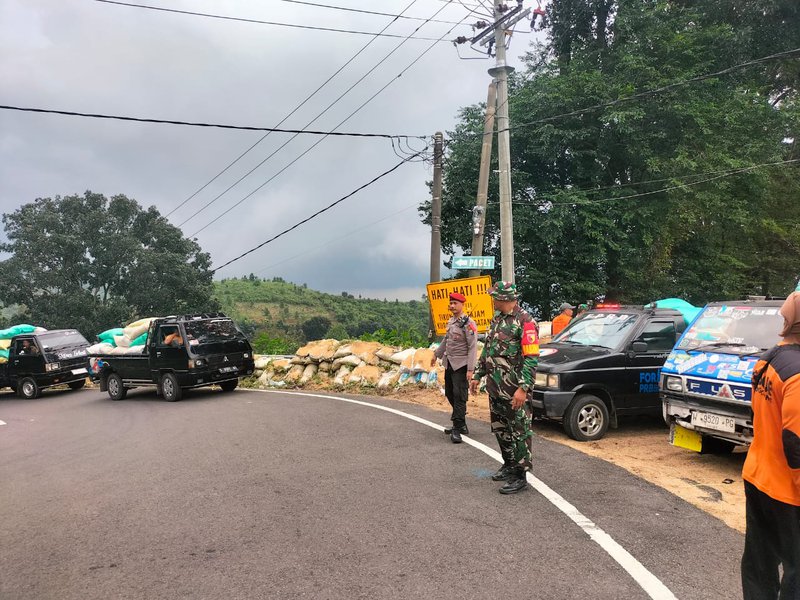 TNI dan Polri mengatur arus kendaraan di tikungan Gotekan, Kec. Pacet, Kab. Mojokerto, Senin, 24 Maret 2025. Foto: relawan