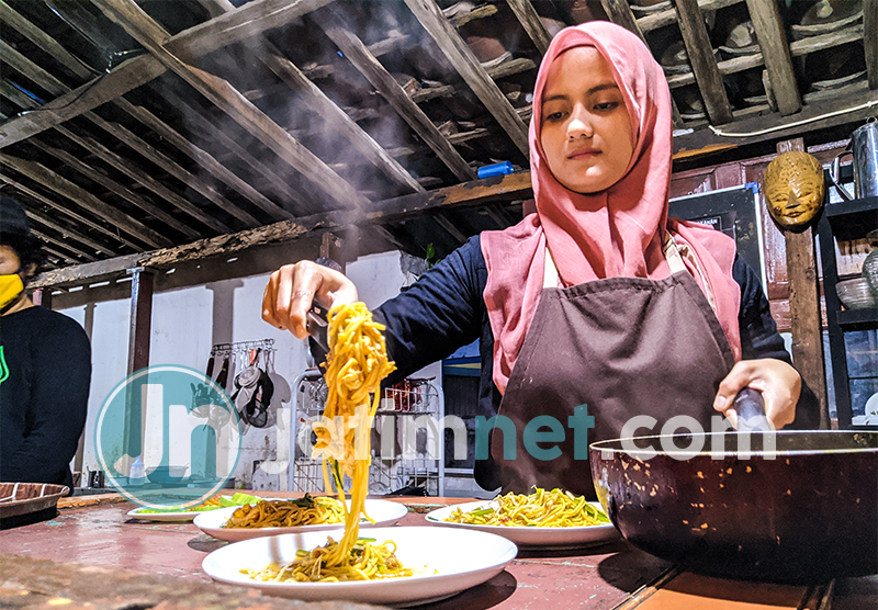 CAFE. Pemilik Cafe, Ismayani saat menyeduhkan menu andalannya, Mie Aceh di tempat cafe miliknya. Foto: Gayuh.