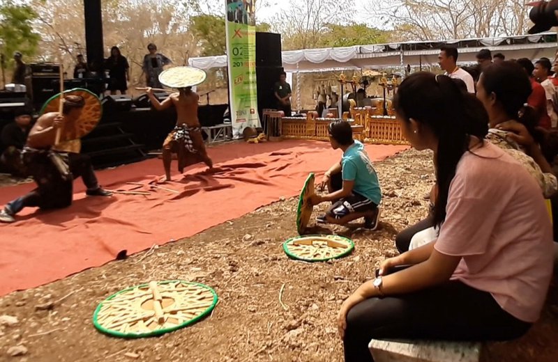 JATIMNET.COM, Surabaya – Dua pemuda memayungi kepala di bawah terik siang, dengan tameng kulit sapi kering berbentuk bundar di tangan kiri. Pemukul rotan di tangan kanan mereka acungkan ke atas mirip pertarugan ala gladiator.