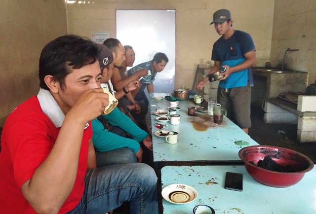 MENIKMATI. Para pelanggan kopi saring Mbok Tajeng sendang menikmati kopi saring yang diproses secara tradisional. Foto: Karin Norhadini