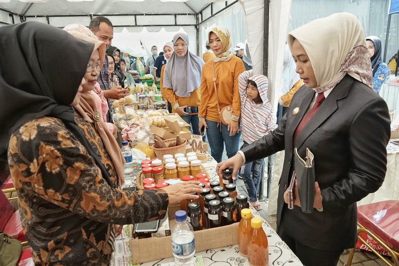 Wali Kota Mojokerto Ika Puspitasari melihat produk olahan pangan dalam Agro Expo 2023 di halaman Kantor Dinas Dinas Ketahanan Pangan dan Pertanian Kota Mojokerto, Sabtu, 28 Oktober 2023. Foto: Dinas Kominfo Kota Mojokerto
