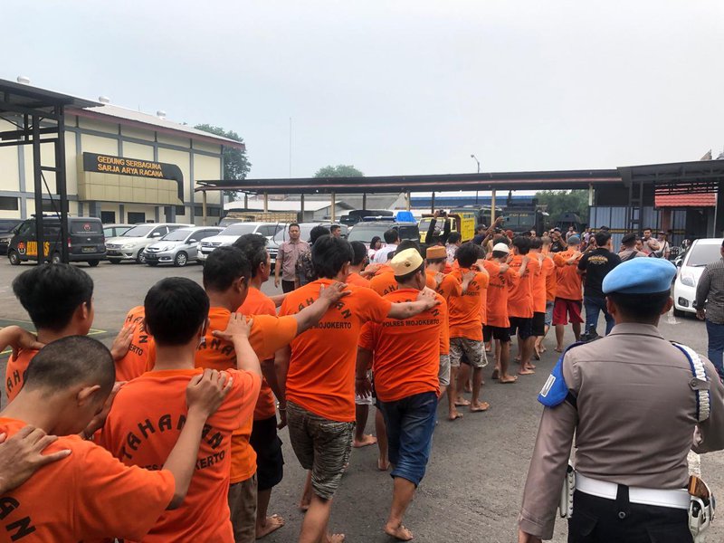 Beberapa tersangka hasil operasi Pekat Semeru saat digelandang dan dihadirkan dalam konfrensi pers di Mapolres Mojokerto, Jumat, 14 Maret 2025. Foto: Hasan