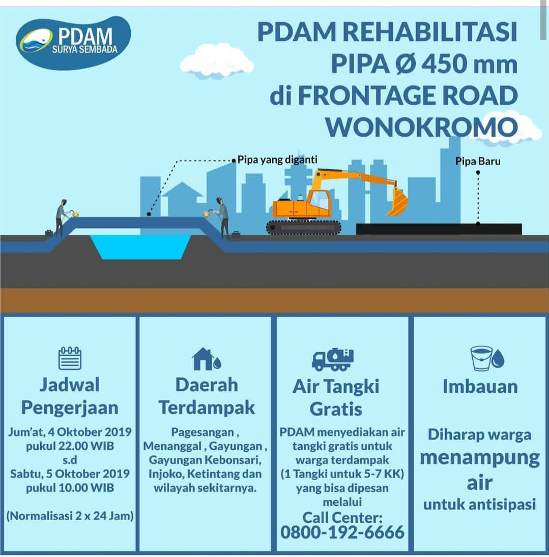 JATIMNET.COM, Surabaya – Perusahaan Daerah Air Minum (PDAM) Surya Sembada akan menggeser pipa berdiameter 450 milimeter di Frontage Road Wonokromo, Jumat 4 Oktober 2019 pukul 22.00 WIB.