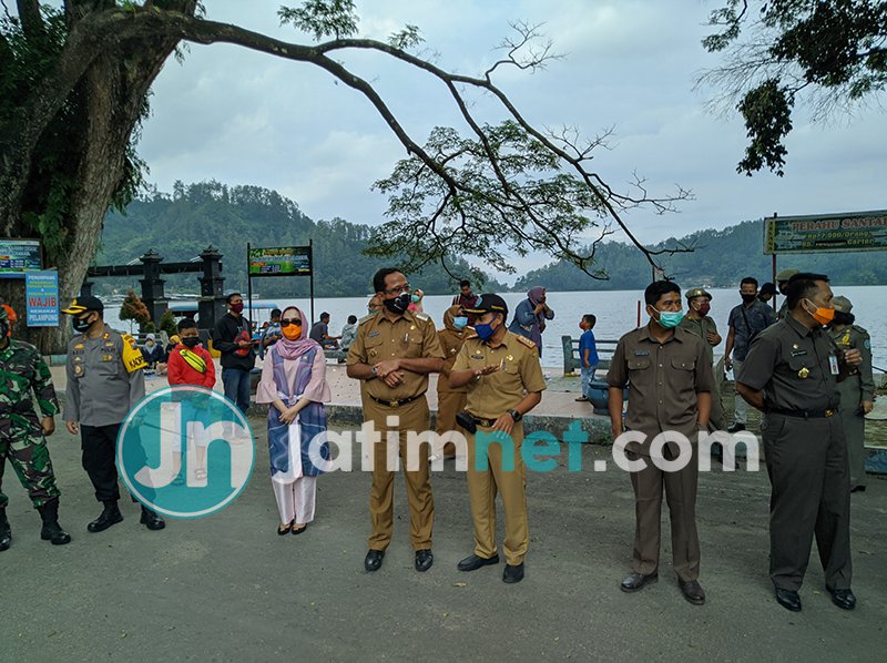 WISATA. Dalam menghadapai New Normal, Bupati Ponorogo, Ipong Muchlissoni saat meninjau tempat keramaian yakni tempat wisata Telaga Ngebel. Foto: Gayuh.