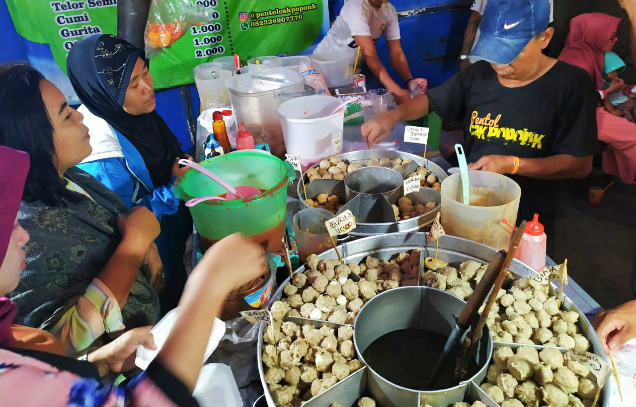 PENTOL SEAFOOF. Penggemar jajanan Pentol asyik memilih isian seafood. Foto: Agus Salim