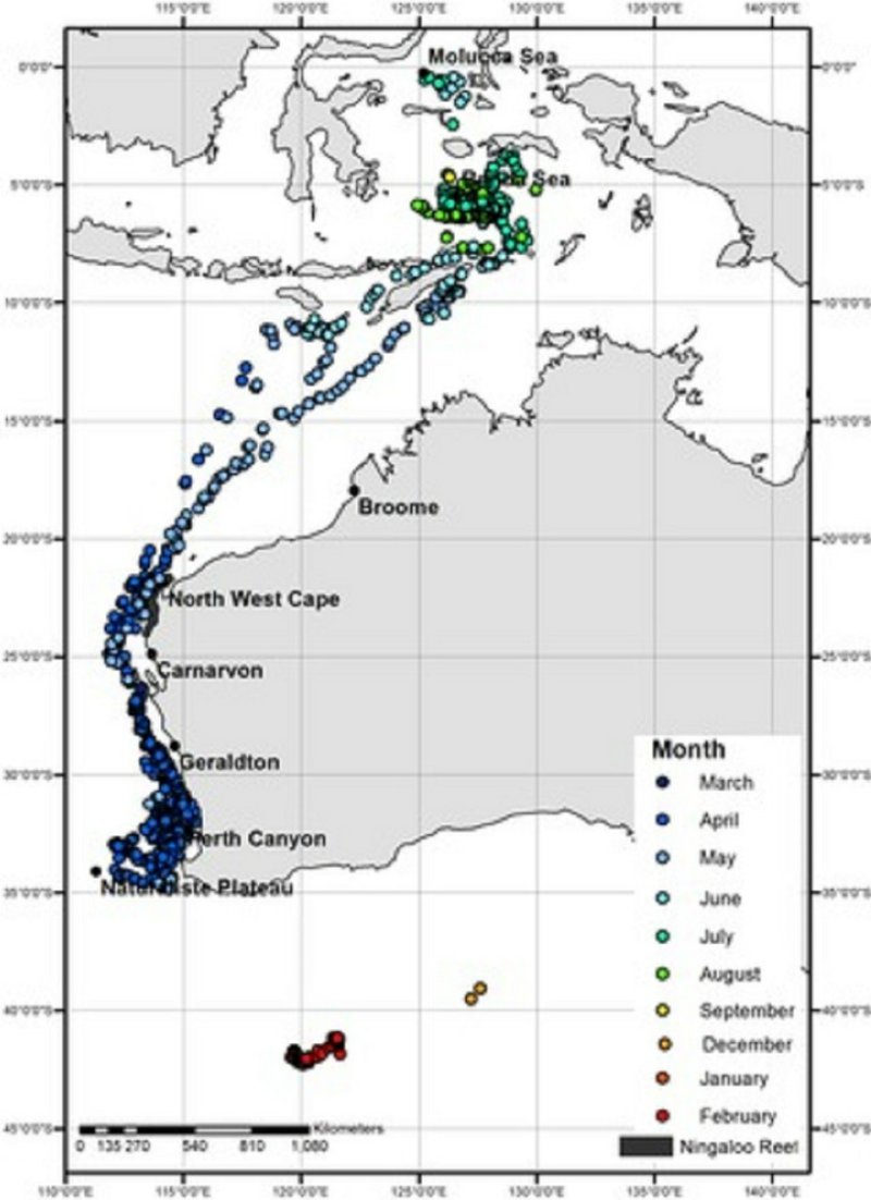 Peta pergerakan migrasi paus tiap bulannya. Sumber: journals.plos.org