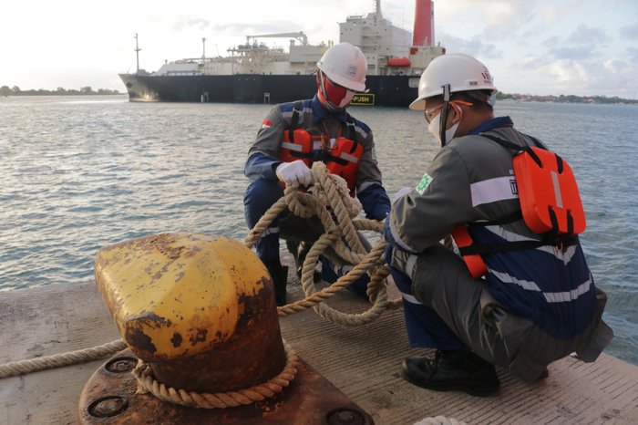 MERAH-PUTIH. Sejumlah tenaga kerja di Terminal LNG Pelabuhan Benoa mengenakan masker merah putih dalam rangka menyambut HUT RI ke-75. Foto: Pelindo III.