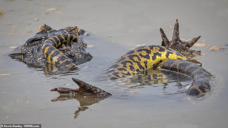 Dooley memperhatikan ketika anakonda sepanjang delapan meter itu mencengkeram hingga mematahkan semua kaki kaiman. Namun kaiman sempat menggigit dan menenggelamkan giginya ke leher ular.