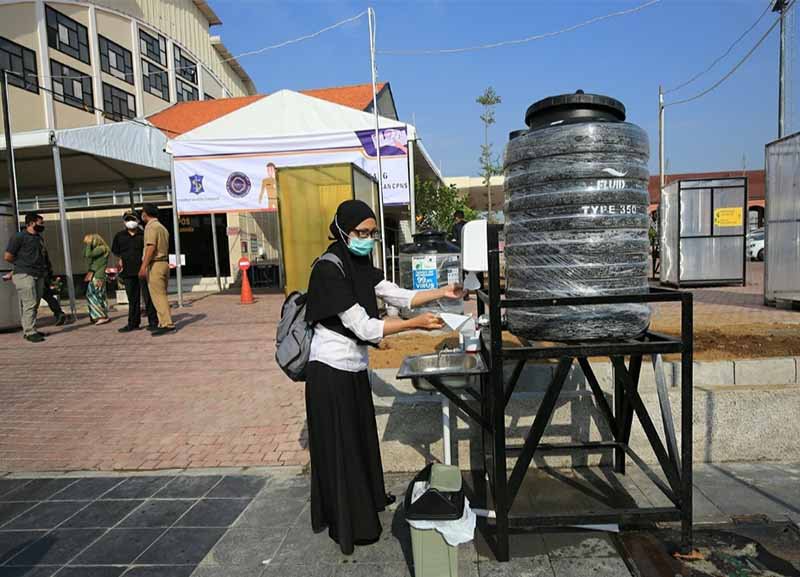 WASTAFEL. Salah satu peserta ujian saat melakukan cuci tangan sebelum masuk dan mengikuti ujian tes SKB CPNS di Gedung Gelora Pancasila Surabaya. Foto: Restu