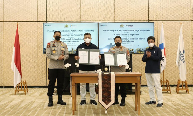 JATIMNET.COM, Jakarta – Komitmen menjaga operasi bisnis sesuai dengan prinsip pengelolaan yang aman dan berkelanjutan, PGN sebagai Subholding Gas Pertamina bersama Direktorat Pengamanan Obyek Vital Nasional dari 9 Kepolisian Daerah (Polda) melakukan penandatanganan Pedoman Kerjasama Teknis (PKT) secara serempak di Kantor PGN Jakarta, Kamis 6 Januari 2022.