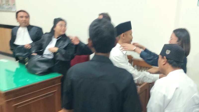 Terdakwa memeluk keluarganya setelah divonis bebas oleh majelis hakim PN Gresik pada Kamis, 23 Oktober 2025. Foto: Agus Salim