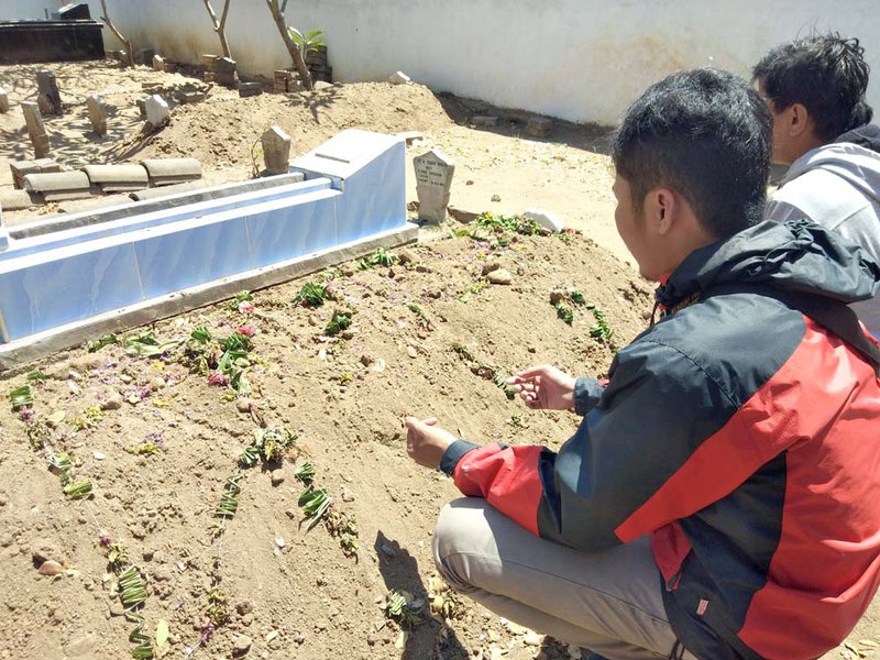 BERDOA: Teman korban berdoa di atas pusara. Foto: Karina Norhadini.
