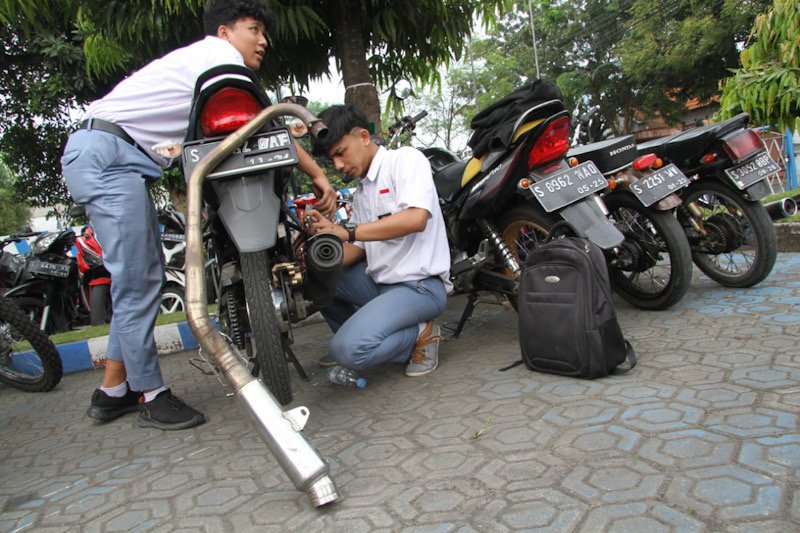 Polisi langsung menyisir parkiran sekolah SMK Dwija Bhakti Jombang, memeriksa satu per satu motor milik para pelajar yang menggunakan knalpot brong.