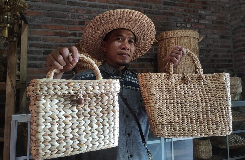 Masrukhan menunjukan hasil produk UMKM olahan bambu. Foto: Diskominfo Kabupaten Mojokerto