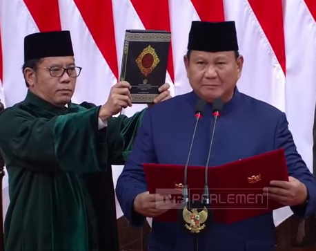 Prabowo Subianto mengucap sumpah dan janji jabatan sebagai Presiden RI periode 2024-2029 di sidang paripurna MPR, Ahad, 20 Oktober 2024. Dok: DPR RI