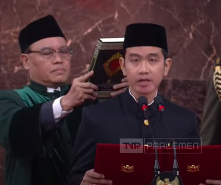 Gibran Rakabuming Raka mengucap sumpah dan janji jabatan sebagai Wakil Presiden RI periode 2024-2029 di sidang paripurna MPR, Ahad, 20 Oktober 2024. Dok: DPR RI