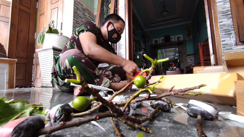 JATIMNET.COM, Mojokerto – Anggota Tentara Nasional Indonesia (TNI) dari Kodim 0815/Mojokerto Kopral Satu (Koptu) I Wayan Sudiyasa berhasil mengembangkan budidaya puluhan jenis bibit buah tin di lahan pertanian Desa Sumbertanggul, Kecamatan Mojosari, Kabupaten Mojokerto.