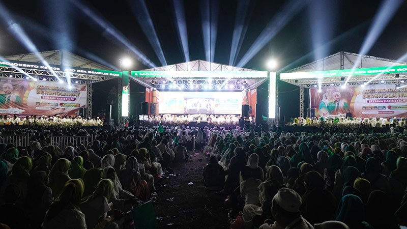 Puluhan ribu umat islam dari berbagai daerah memenuhi lapangan Surodinawan Kota Mojokerto menghadiri kegiatan Hari Jadi Kota Mojokerto (HJKM) yang ke-105, Senin 12 Juni 2023 malam