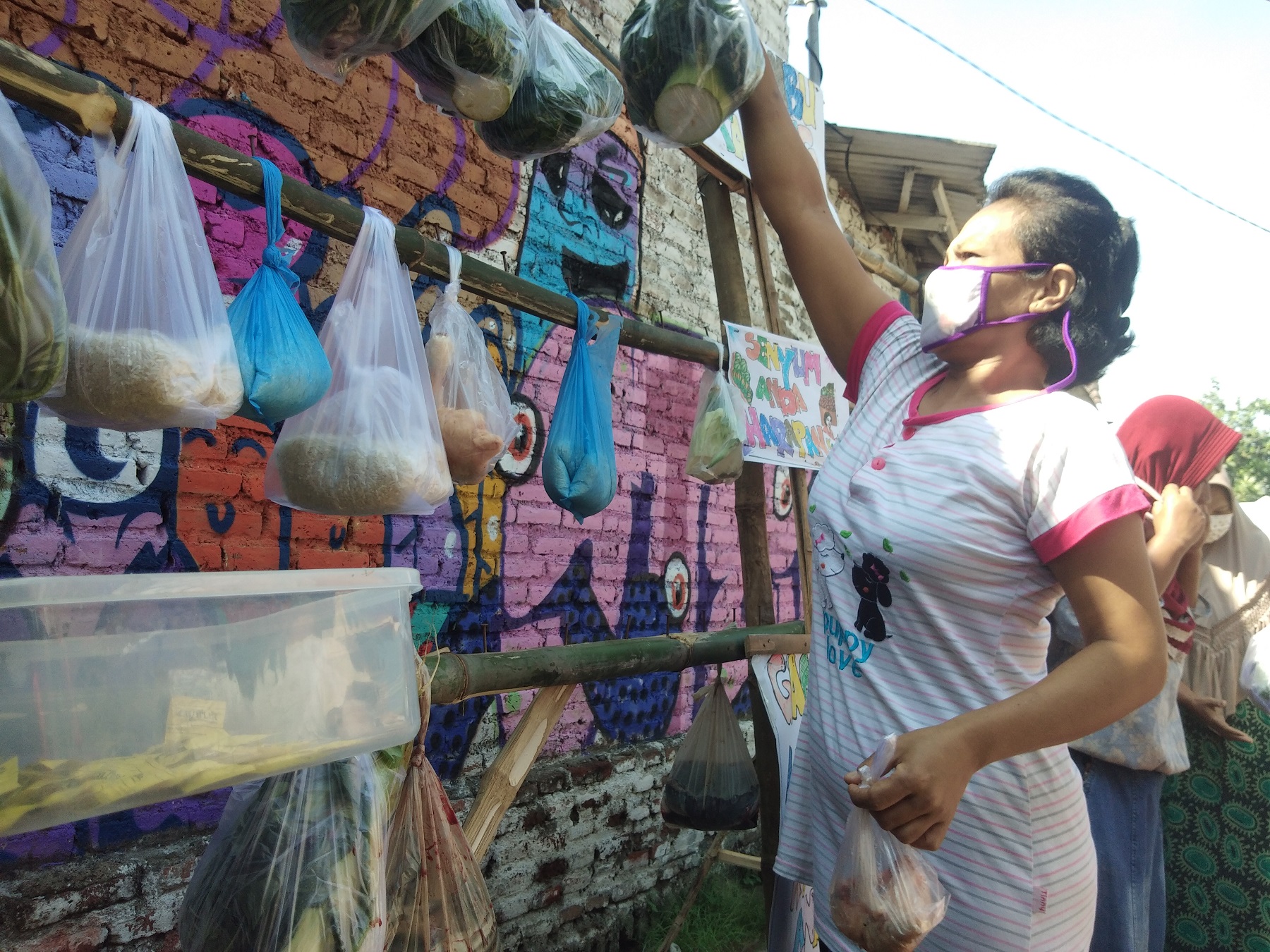 Akhirnya warga setempat berinisiatif membuat tempat yang digunakan sebagai tempat meletakkan bahan pangan yang dibutuhkan warga. Tempat tersebut berupa rak dari bambu dan warga menyebutnya sebagai “Rak Bambu Penyambung Tangan”.