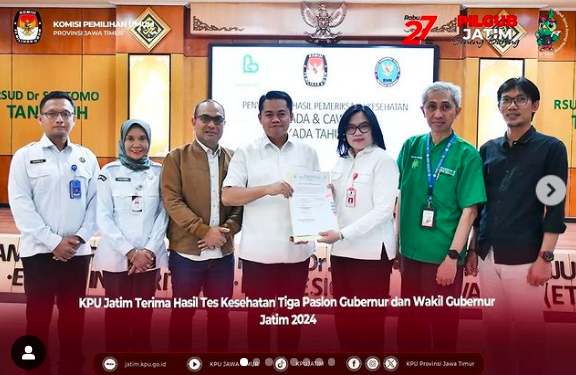 Komisi Pemilihan Umum Provinsi Jawa Timur (KPU Jatim) menerima hasil tes kesehatan tiga pasangan calon Gubernur dan Wakil Gubernur Jatim 2024 dari RSUD dr. Soetomo Surabaya. Serah terima dilaksanakan di Ruang Loka Widya RSUD dr. Soetomo, Jalan Prof. Dr. Moestopo nomor 6-8, Gubeng, Surabaya, Senin, 2 September 2024.