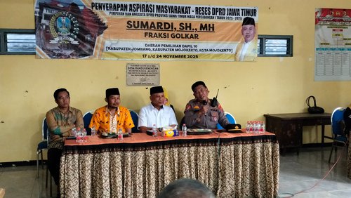 JATIMNET.COM, Mojokerto - Anggota DPRD Provinsi Jawa Timur dari Fraksi Partai Golkar, Sumardi, SH, menggelar kegiatan reses di Balai Desa Randugenengan, Kecamatan Dlanggu, Kabupaten Mojokerto, Rabu 19 November 2025. Kehadiran legislator asal Dapil Jawa Timur itu mendapat sambutan meriah dari warga yang datang menyampaikan aspirasi secara langsung.