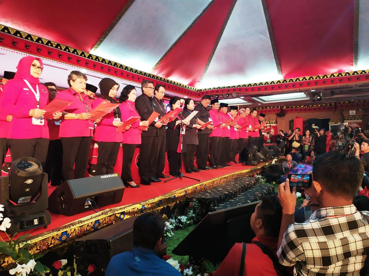 SUMPAH JABATAN. Pengurus DPP PDI Perjuangan periode 2019-2024 membaca sumpah jabatan dalam Kongres V di Bali, Sabtu 10 Agustus 2019. Foto: Opik.