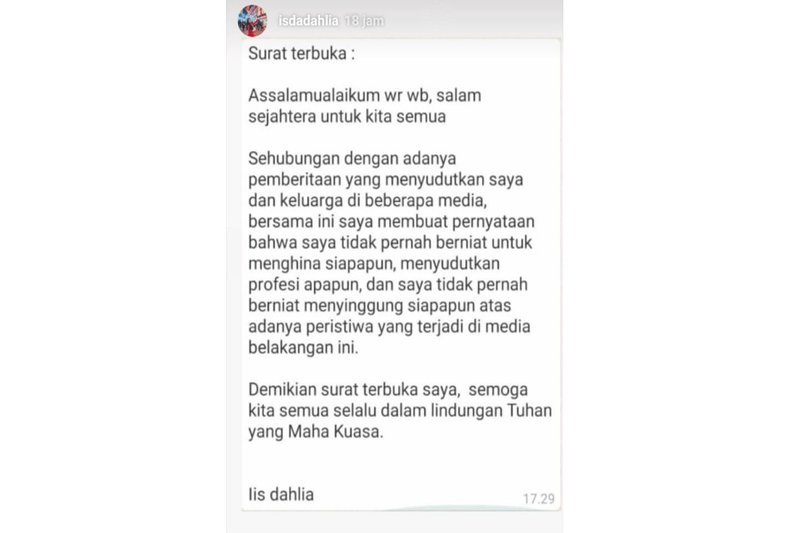 ''Surat terbuka: Assalamualaikum wr wb, salam sejahtera untuk kita semua. Sehubungan dengan adanya pemberitaan yang menyudutkan saya dan keluarga di beberapa media, bersama ini saya membuat pernyataan bahwa saya tidak pernah berniat untuk menghina siapapun, menyudutkan profesi apapun, dan saya tidak pernah berniat menyinggung siapapun atas adanya peristiwa yang terjadi di media belakangan ini. Demikian surat terbuka saya, semoga kita semua selalu dalam lindungan Tuhan yang Maha Kuasa Iis Dahlia,'' tulisnya.
