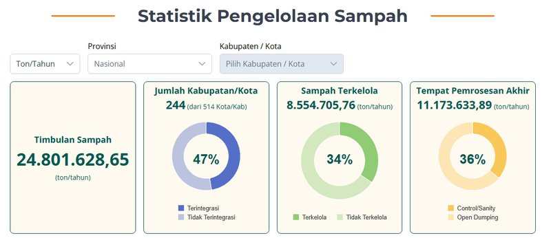 Pengelolaan sampah di Indonesia masih memprihatinkan. Menurut portal Sistem Informasi Pengelolaan Sampah Nasional (SIPSN) Kementerian Lingkungan Hidup, selama tahun 2025 terdapat 24,8 juta timbulan sampah dan masih 244 kota/kabupaten (47 persen) dari 514 kota/kabupaten yang memiliki pengelolaan sampah terintegrasi.