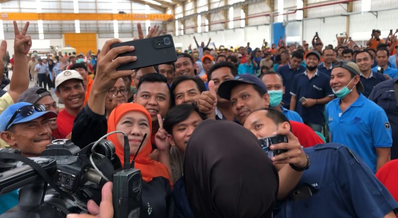 Bahkan ribuan karyawan pabrik yang menunggunya sejak pagi antusias dan berebut bersalaman menyambut kedatangan mantan Gubernur Jatim periode tahun 2019-2024 itu.