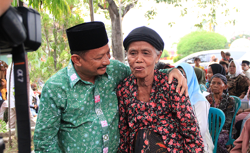 PEDULI: Bupati Situbondo Karna Suwandi memeluk wanita lansia penerima BLT DBHCHT. Foto: Hozaini