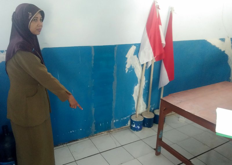 Guru MI Sabilullrosyad Ummi Hanik menunjukkan pintu kelas yang tidak bisa dikunci karena dindingnya retak, Senin 18 November 2019. Foto: Karina Norhadini.