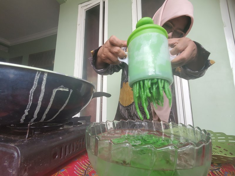 Pembuatan dawet berbahan tepung beras, tepung tapioka, dan daun kelor kreasi ibu-ibu PKK Pulorejo, Kec. Prajurit Kulon, Kota Mojokerto. Foto: Hasan