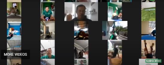 LATIHAN ONLINE. Para pemain Persebaya melakukan latihan fisik secara online dipantau pelatih dan para official. Tampak tangkapan layar latihan online para pemain Persebaya. Dok: persebaya.id