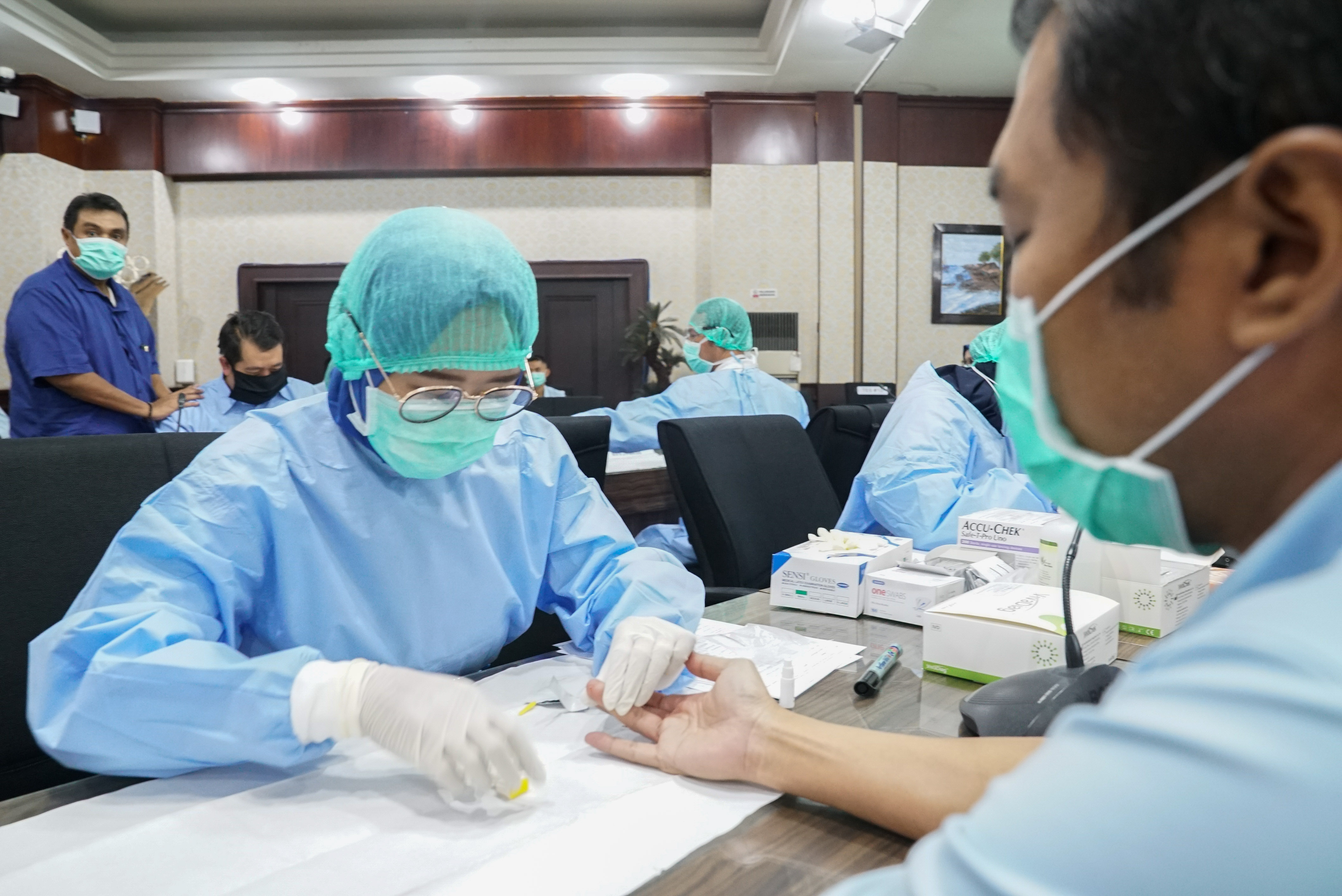 KONTROL. Petugas medis melakukan pemeriksaan kepada pegawai Pelindo III sebagai langkah pencegahan penularan virus corona. Foto: Pelindo III
