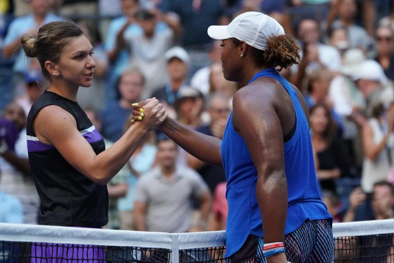 UCAPAN SELAMAT. Simona Halep (kiri) memberikan ucapan selamat kepada Taylor Townsend yang mengalahkannya di babak kedua AS Terbuka, Jumat 30 Agutus 2019. Foto: WTAtennis.com