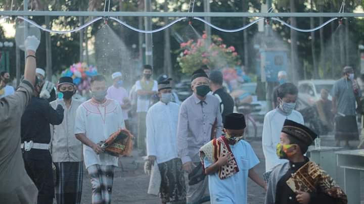 SALAT ID. Takmir masjid Jamik Baitul Amin, Jember, tetap menggelar salat Idul Fitri dengan menyemprotkan disinfektan pada setiap jemaah, Minggu, 24 Mei 2020. Foto: Faizin Adi