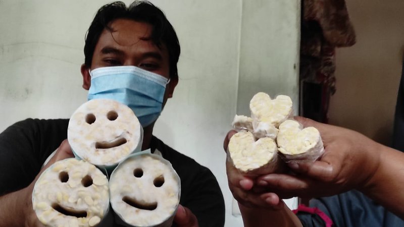 "Akhirnya ketemu ide membuat tempe dalam bentuk berbeda. Ada dua, yaitu bentuk smile dan love ini. Untuk bentuk smile, saya mendapatkan bantuan 30 pipa paralon secara gratis," katanya. Pipa paralon tersebut digunakan sebagai alat bantu mencetak tempe.
