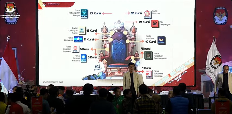Komisioner KPU Jatim dibantu petugas membacakan perolehan kursi parpol dan 120 nama calon terpilih Anggota DPRD Jatim dari 14 Daerah Pemilihan (Dapil) periode 2024-2029. Setelah dibacakan, Ketua KPU Jatim Aang Khunaifi sebagai pimpinan rapat menetapkan.