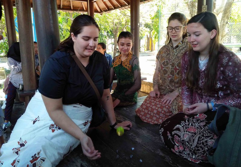 MAINAN TRADISIONAL. Sejumlah mahasiswa Universitas Oklahoma Amerika Serikat sedang bermain mainan tradisional di Unitomo Surabaya. Foto: Khoirotul Lathifiyah